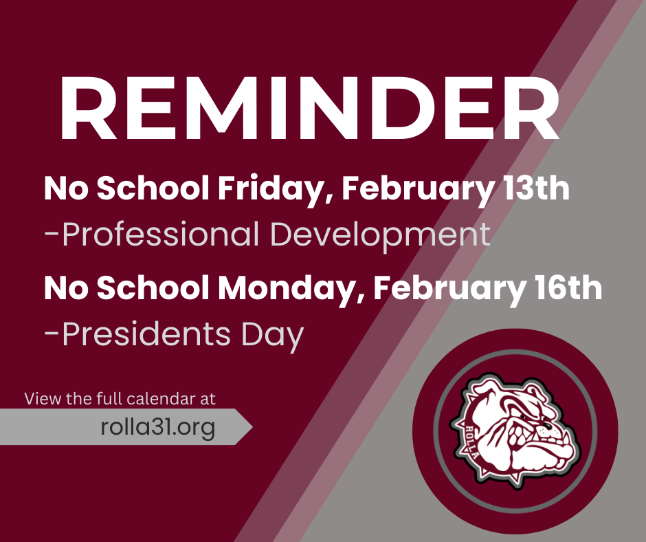 REMINDER: Classes will not be in session on Friday, February 13, 2026 (Professional Development), or Monday, February 16, 2026 (Presidents' Day). Have a great weekend, Bulldogs!